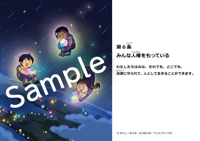 世界人権宣言は、すべての人間が生まれながらに基本的人権を持っているということを、 初めて公式に認めた宣言です。アムネスティ日本では、この世界人権宣言全30条を、詩人の谷川俊太郎さんと一緒にわかりやすい日本語に翻訳し、「人権パスポート」(パスポートサイズの小冊子)にまとめて一冊100円で販売しています。また、子どもたちが身近に世界人権宣言に触れ、また、人権への知識と理解を深めるきっかけになればと、子ども向けのウェブサイト「イラストで考える世界人権宣言」を公開しました。学校関係者の方には、人権教育の教材としてイラストや条文を提供しています。